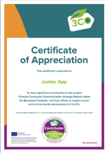 Junker ha ottenuto il Certificate of Appreciation del progetto Horizon 3-CO “for their significant contribution to the project ‘Concise Consumer Communication through Robust Labels for Bio-based Products’ and their efforts to support social and environmental development in the EU.